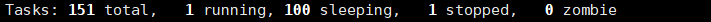 第二行显示的是任务或者进程的总结。进程可以处于不同的状态。这里显示了全部进程的数量。除此之外,还有正在运行、睡眠、停止、僵尸进程的数量(僵尸是一种进程的状态)。这些进程概括信息可以用’t’切换显示。