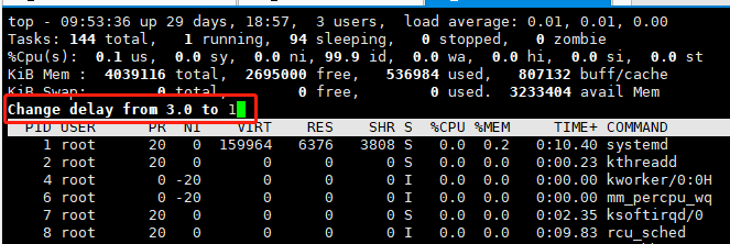 当按下’d’或’s’时,你将被提示输入一个值(以秒为单位),它会以设置的值作为刷新间隔。如果你这里输入了1,top将会每秒刷新。