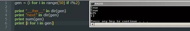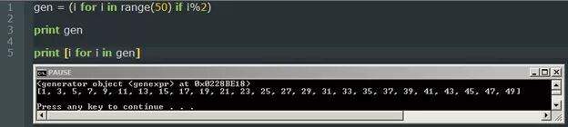 生成器表达式并不是创建一个列表, 而是返回一个生成器,这个生成器在每次计算出一个条目后,把这个条目”产生”(yield)出来。 生成器表达式使用了”惰性计算”(lazy evaluation),只有在检索时才被赋值(evaluated),所以在列表比较长的情况下使用内存上更有效。
