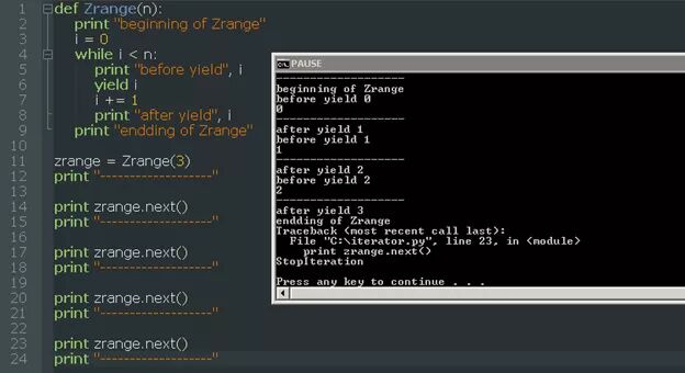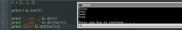例子中,通过iter()方法获得了list的迭代器对象,然后就可以通过next()方法来访问list中的元素了。当容器中没有可访问的元素后,next()方法将会抛出一个StopIteration异常终止迭代器。