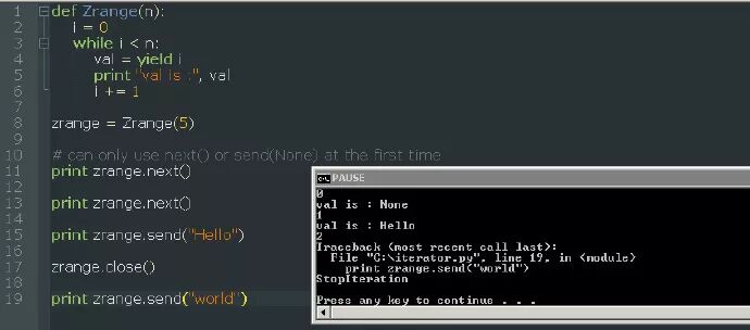 Python 2.5中,yield语句变成了yield表达式,也就是说yield可以有一个值,而这个值就是send()方法的参数,所以send(None)和next()是等效的。同样,next()和send()的返回值都是yield语句处的参数(yielded value)