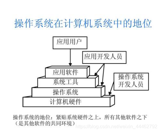 操作系统(Operating System)是运行在计算机上的最重要的程序,它可以管理和控制计算机的活动。 硬件、操作系统、应用程序和用户之间的关系如下图。