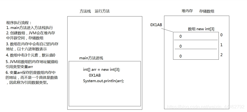 以上方法执行,输出的结果是[@5f150435,这个是什么呢?是数组在内存中的地址。new出来的内容,都是在堆 内存中存储的,而方法中的变量arr保存的是数组的地址。 输出arr[0],就会输出arr保存的内存地址中数组中0索引上的元素