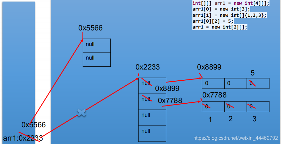 - 对于二维数组的理解,我们可以看成是一维数组 array1又作为另一个一维数组array2的元素而存 在。其实,从数组底层的运行机制来看,其实没有多维数组。