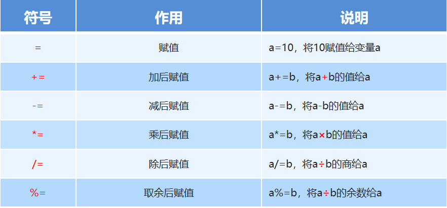 赋值类的运算符包括基本赋值运算符(=)和扩展的赋值运算 符(+=、-=、*=、/=、%=)常见的如下图所示