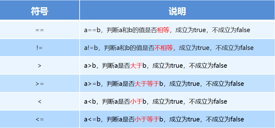 关系运算符主要是完成数据和数据之间的比较,比如:5>3,结果是 true(真),5>10, 结果是 false(假),那么关系运算符如下图所示:
