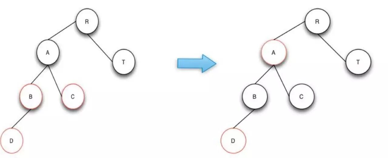 由于兄弟节点是红色节点的时候,无法借调黑节点,所以需要将兄弟节点提升到父节点,由于兄弟节点是红色的,根据RBTree的定义,兄弟节点的子节点是黑色的,就可以从它的子节点借调了。