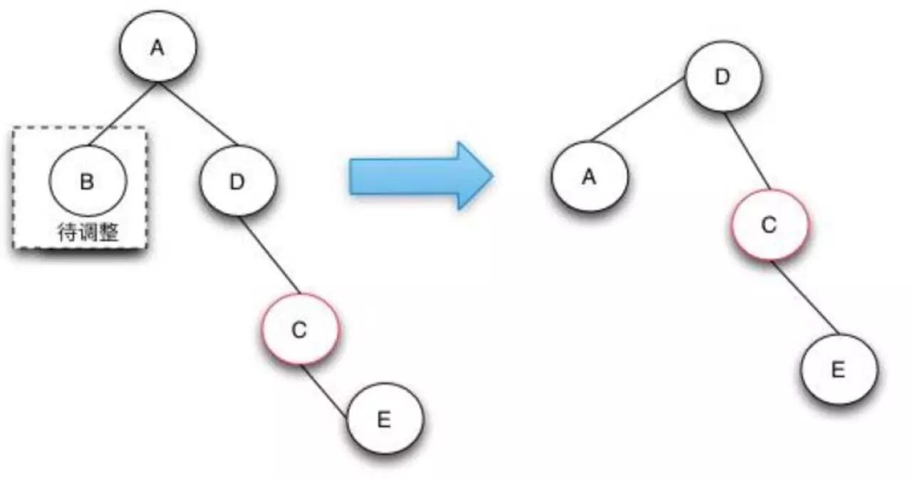 待调整的节点的兄弟节点是黑色的节点,且兄弟节点的左子节点是红色的,右节点是黑色的(兄弟节点在右边),如果兄弟节点在左边的话,就是兄弟节点的右子节点是红色的,左节点是黑色的。