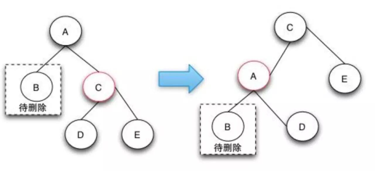 case 3的删除操作是一个中间步骤,它的目的是将左边的红色节点借调过来,这样就可以转换成case 4状态了,在case 4状态下可以将D,E节点都阶段过来,通过将两个节点变成黑色来保证红黑树的整体平衡。