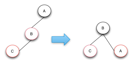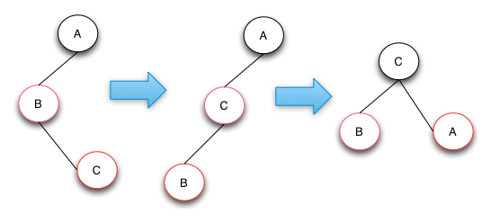 case 2的操作是将B节点进行右旋操作,并且和父节点A互换颜色。通过该修复操作RBTRee的高度和颜色都符合红黑树的定义。如果B和C节点都是右节点的话,只要将操作变成左旋就可以了。