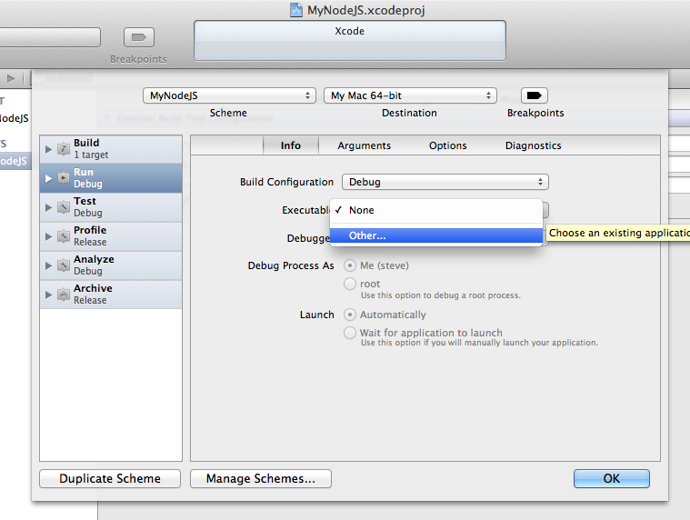 选择: 'Arguments' 在Arguments Passed On Launch新增(+): '$(SOURCE_ROOT)/src/index.js' Expand Variables Based On: 'MyNodeJS'