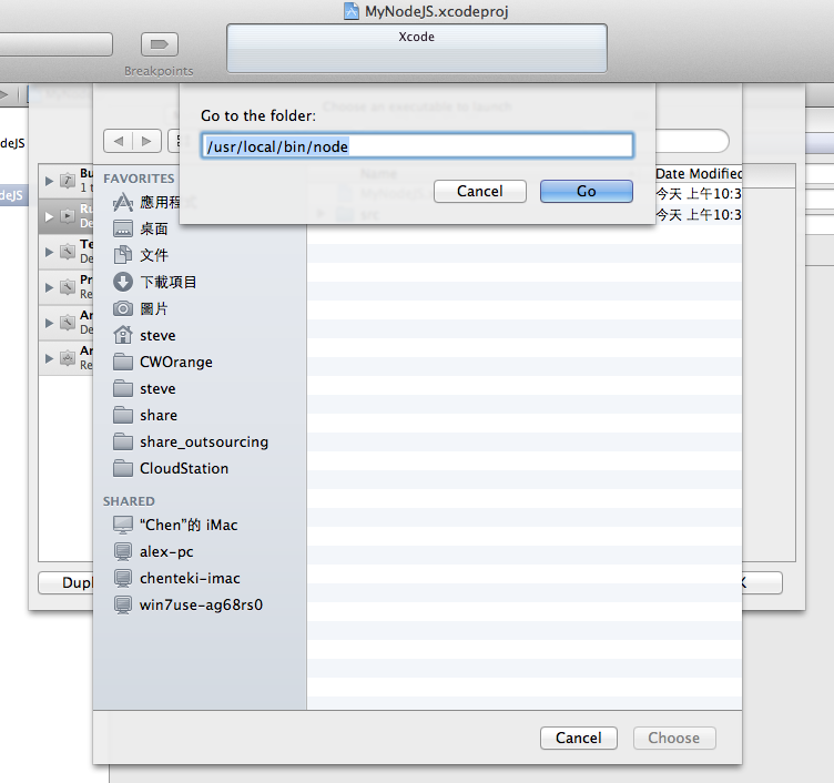 现在,必须在Xcode上面做一些设定,让Xcode可以直接呼叫node去执行.js檔。