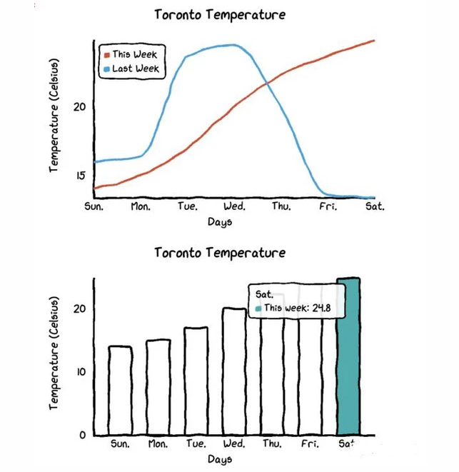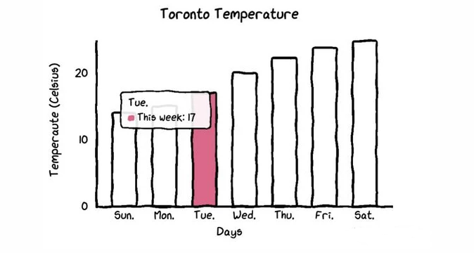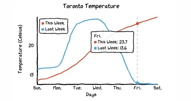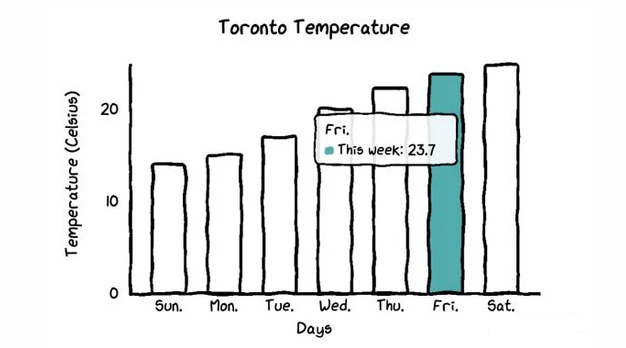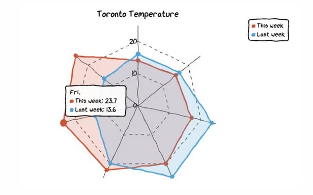 当你把鼠标悬停在图表上时,图表会自动显示带有数字的标签,而且还画了一条虚线,这样本周和上周的气温差异就更加直观了。
