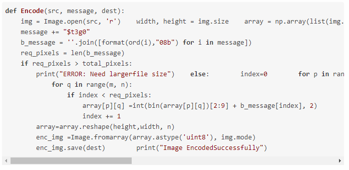 接着,检查可用的总像素是否足够用于秘密消息。如果继续逐个迭代像素,并将它们的最低有效位修改为秘密消息的位,直到包括分隔符的完整消息已经被隐藏。