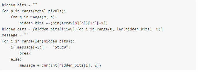 其次,需要从图像左上角开始的每个像素中提取最低有效位,并以8个为一组存储。接下来,将这些组转换成ASCII字符来查找隐藏的消息,直到完全读取之前插入的分隔符。