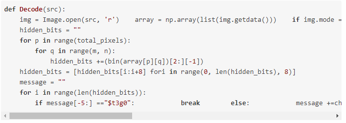 要解码一个已编码的图像,只需颠倒这个过程:收集并存储每个像素的最后一位,将它们分成8个一组,并将其转换回ASCII字符,以得到隐藏的信息。