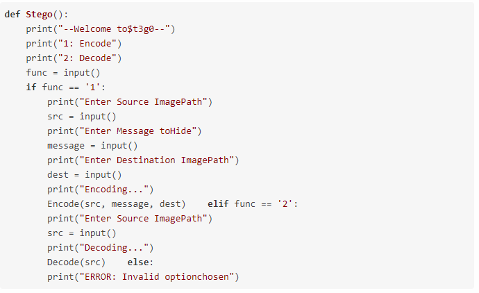 若是编码,则要求用户输入以下内容——带扩展名的源图像名称、秘密消息和带扩展名的目标图像名称。若是解码,则要求用户提供隐藏了消息的源图像。