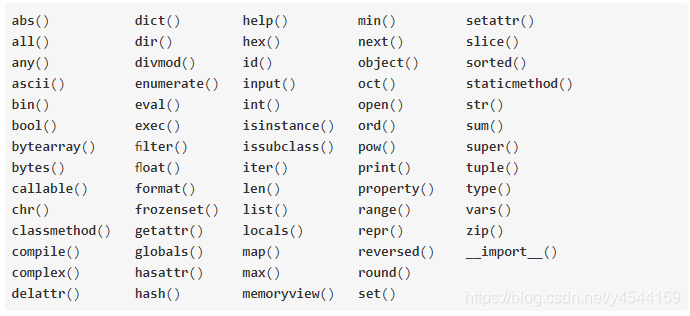 截止到python版本3.6.2 ,一共提供了68个内置函数,具体如下
