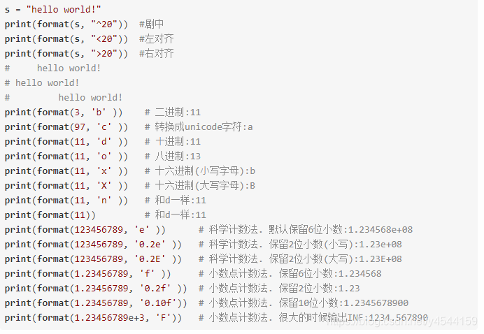 - format() 与具体数据相关, 用于计算各种小数, 精算等.