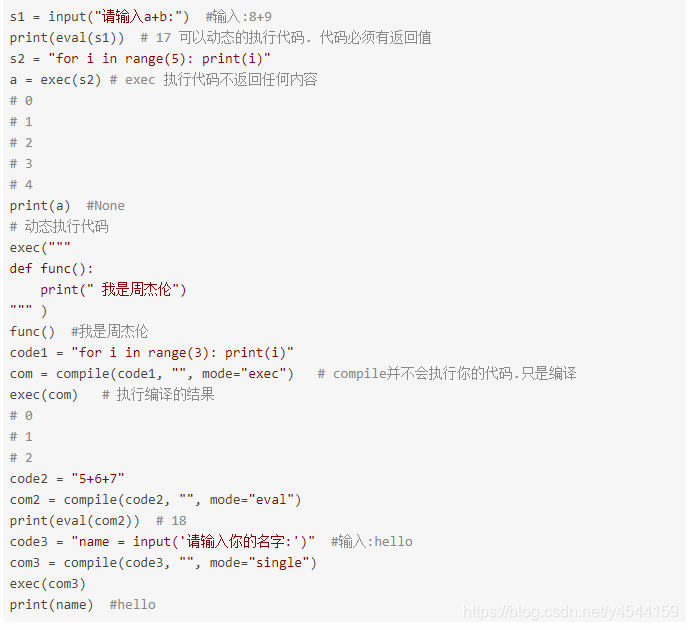 - compile() 将字符串类型的代码编码. 代码对象能够通过exec语句来执行或者eval()进行求值