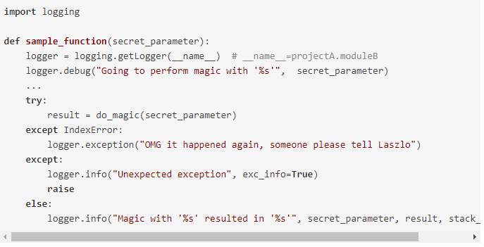 现在我们已经了解了 logging 模块的部分及设计,是时候去了解一个开发者是如何与它交互的了。以下是一个代码例子: