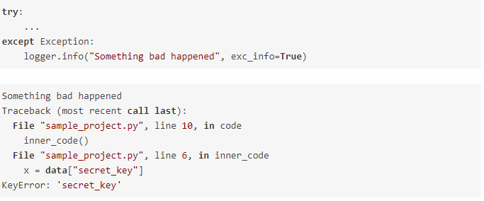但是这样的代码会给我们显示类似于 Something bad happened: “secret_key.” 的日志行,这并不是很有用。如果我们使用 exc_info 作为事先说明,那么它将会如下显示:
