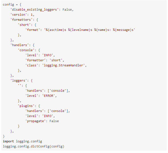 所有元素的设置以及如何连接它们可以作为字典来说明。这个字典应当由不同的部分组成,包括记录器、处理器、格式化以及一些基本的通用参数。