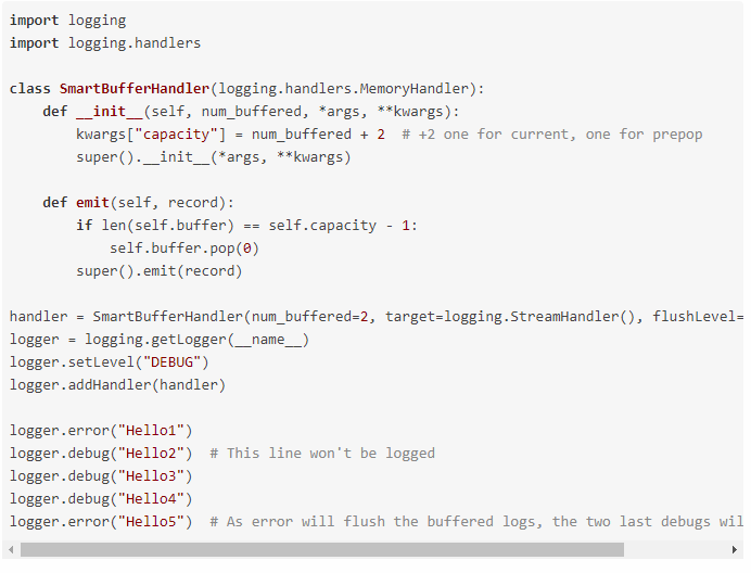 有时候当错误发生时,我们想要排除日志故障。创建一个缓冲的处理器,来记录当错误发生时的最新故障信息是一种可行的办法。下面的代码是个非人为策划的例子: