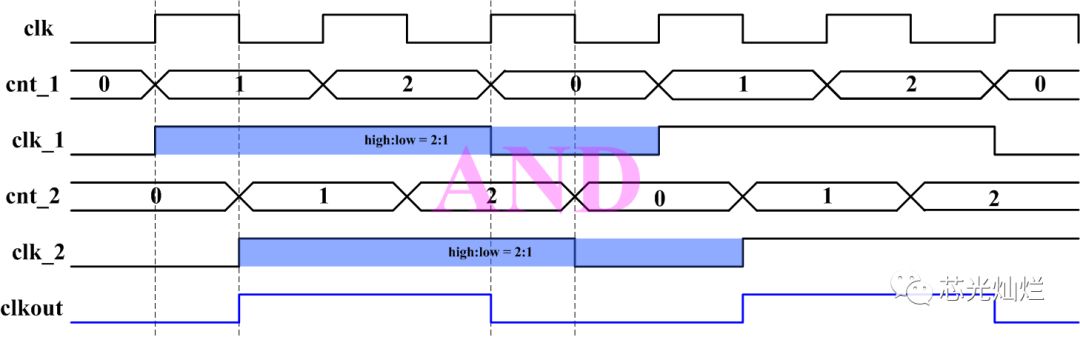 第三步:cnt2计数到0或者计数到2(即2N)时,clk2翻转,从而得到占空比为2:3的clk2;