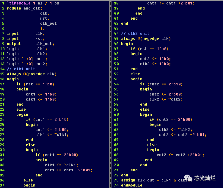 前两种方法使用了两个计数器,最后一种方法使用了一个计数器.因为偶数分频的半时钟周期为原时钟周期的偶数倍,奇数分频时钟周期的半周期为原来时钟周期整数倍加半个时钟周期,因此在进行奇数分频时一定要注意获取到原时钟周期的半个周期,这样才能在进行各种逻辑操作后获取到期望的奇数分频器.