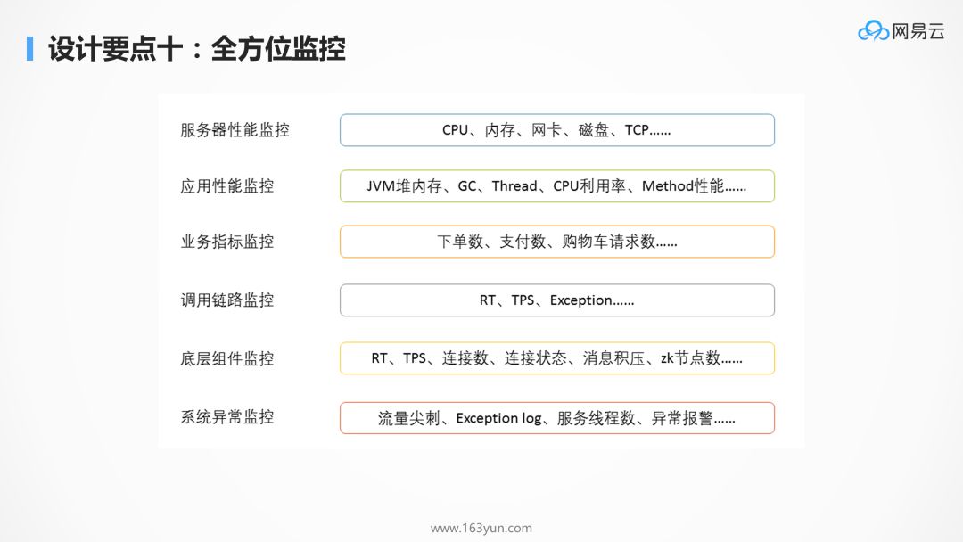 当系统非常复杂的时候,要有统一的监控,主要有两个方面,一个是是否健康,一个是性能瓶颈在哪里。当系统出现异常的时候,监控系统可以配合告警系统,及时地发现,通知,干预,从而保障系统的顺利运行。