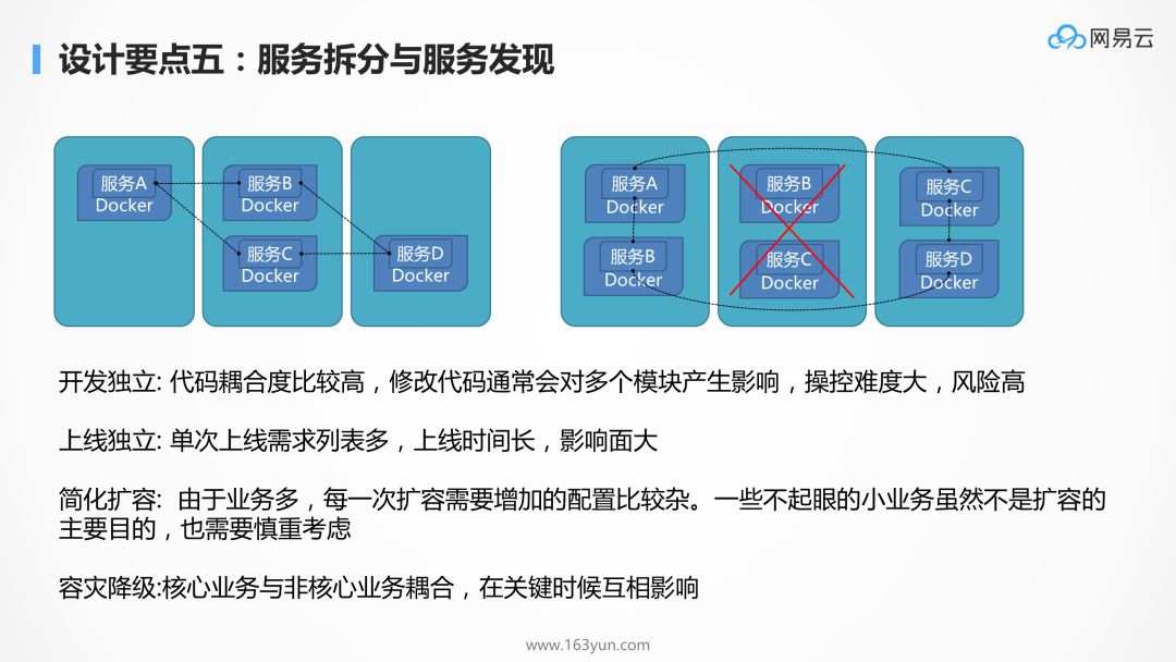 另外再就是高并发时段的扩容,往往只有最关键的下单和支付流程是核心,只要将关键的交易链路进行扩容即可,如果这时候附带很多其他的服务,扩容即是不经济的,也是很有风险的。