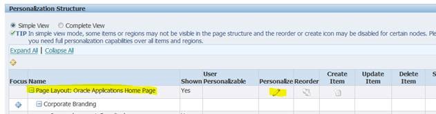 To make the change, login to the homepage and select the 'personalize page' link at the top right of the page. Select the pencil icon for the very first option in the list. This should be 'Page Layout: Oracle Applications Home Page'
