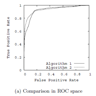 以召回率为y轴,以特异性为x轴,我们就直接得到了RoC曲线。从召回率和特异性的定义可以理解,召回率越高,特异性越小,我们的模型和算法就越高效。也就是画出来的RoC曲线越靠近左上越好。如下图左图所示。从几何的角度讲,RoC曲线下方的面积越大越大,则模型越优。所以有时候我们用RoC曲线下的面积,即AUC(Area Under Curve)值来作为算法和模型好坏的标准。