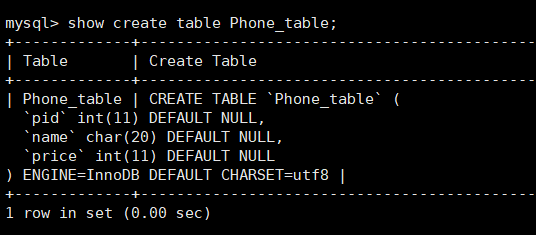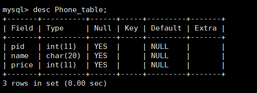 在 MyDB_one 中创建了一个叫 Phone_table 的数据表,这张表有三个字段 pid,name,price 。为了增加 SQL 的可读性,字段名我用的是小写,字段类型用大写。