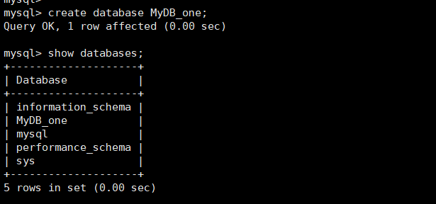 创建数据库成功后,数据库的数量变成了5个,多了刚才创建的 MyDB_one 。