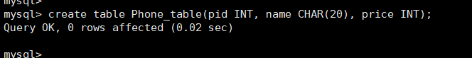 create table Phone_table(pid INT, name CHAR(20), price INT);