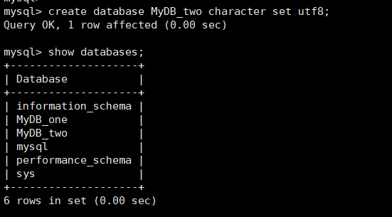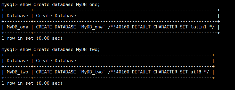 如果不知道一个数据库的编码方式是什么,可以使用 show create database 数据库名 来查看数据库的编码方式。可以看到刚才创建的 MyDB_one 的编码方式是 MySQL 的默认编码 latin1 ,MyDB_two 的编码方式是 utf-8 。