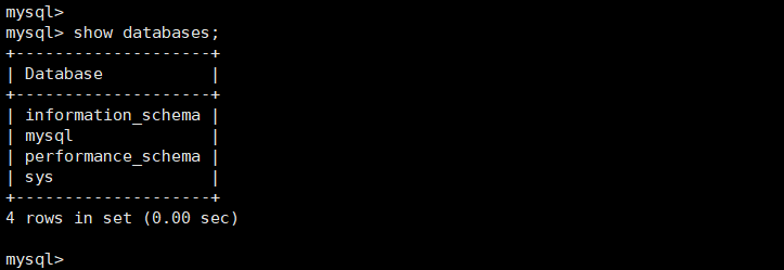 使用 show databases; 查看当前安装的 MySQL 中有哪些数据库。