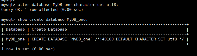 如果一个数据库的编码方式不符合使用需求,可以进行修改。刚才创建的 MyDB_one 经过修改后,编码方式也变成了 utf-8 。