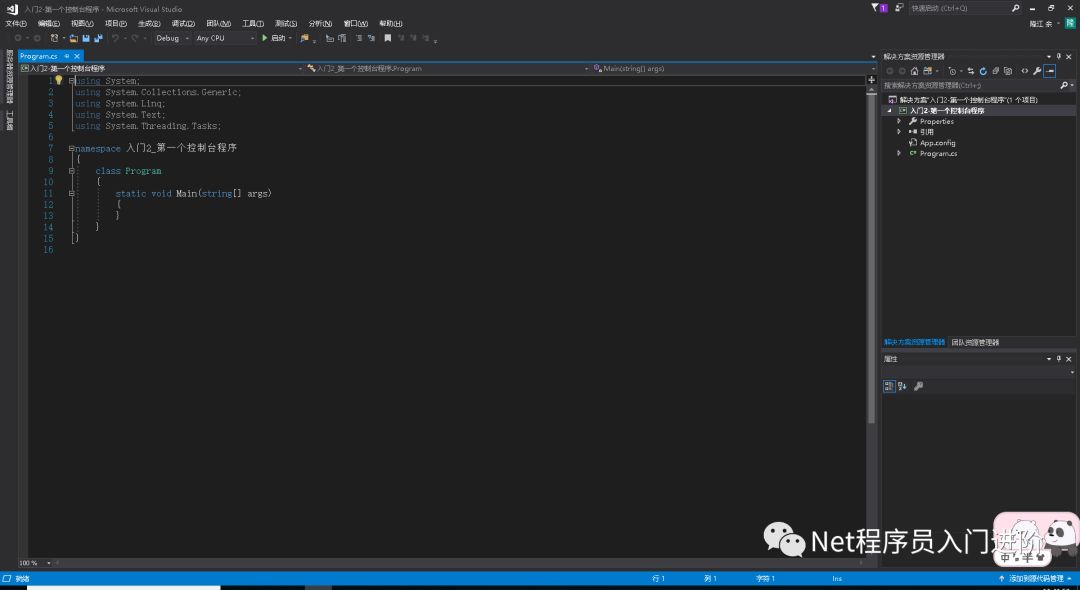 当然这个程序是空的什么都没有,只有一个空的main方法,main方法是控制台程序的入口,也就是一个程序最开始执行的地方,我们就在这里面写上自己的代码让程序执行