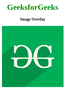 <!DOCTYPE HTML> <html> <head> <meta charset="UTF-8"> <title>Image Overlay</title> <style> body { text-align: center; } h1 { color: green; } .container img { width: 250px; height: 250px; } .container { position: relative; width: 400px; height: auto; } .overlay { position: absolute; transition: all 0.3s ease; opacity: 0; } .container:hover .overlay { opacity: 1; } .overlayFade { height: 250px; width: 250px; top: 0; left: 75px; } </style> </head> <body> <center> <h1 class="title"> GeeksforGeeks </h1> <b>Image Overlay</b> <br> <br> <div class="container"> <img src= "https://media.geeksforgeeks.org/wp-content/uploads/20200325132558/download311.png" class="image"> <div class="overlay overlayFade"></div> </div> </center> </body> </html>