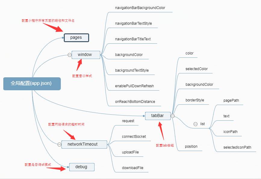 微信小程序的配置文件是一个树状结构,各个节点代表不同的配置项,小程序框架会解析这个文件,作为APP的全局配置。