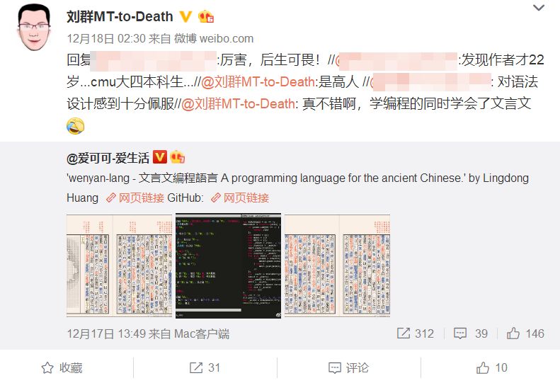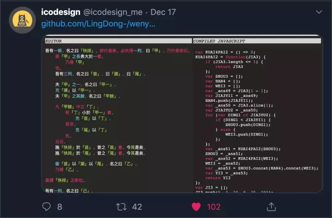 这两天刷微博、朋友圈、公众号,发现大家都被一个文言文编程的项目圈粉了。