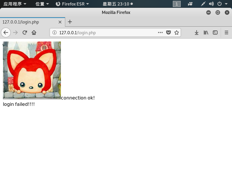 " ; } /* free result set */ $result->close(); } $mysqli->close(); ?x> `` - 4.在浏览器输入``127.0.0.1/login.html``访问自己的登录界面:  ## (5).最简单的SQL注入,XSS攻击测试(0.5分) - 1.在用户名输入框输入``' or 1=1#``,密码任意输入,可登陆成功:  这是因为,输入的用户名和我们的代码中``select``语句组合起来变成了``select * from users where username='' or 1=1#' and password='';``,``#``相当于注释符,会把后面的内容都注释掉,而``1=1``是永真式,所以这个条件永远成立,所以不管密码是否输入正确,都能够成功登陆。 - 2.XSS攻击: 将一张图片放在``/var/www/html``目录下,在用户名输入框输入``