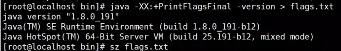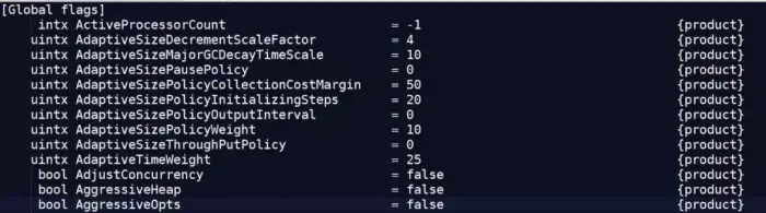 java -XX:+PrintFlagsFinal -version > flags.txt