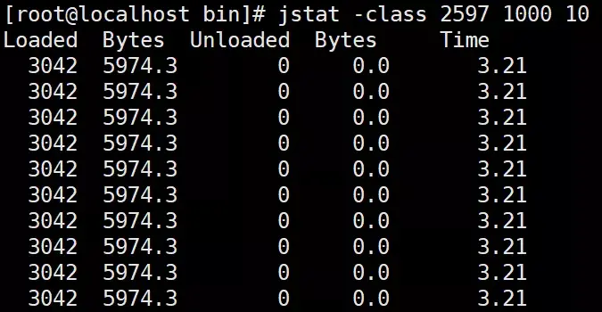 jstat -class PID 1000 10 查看某个java进程的类装载信息,每1000毫秒输出一次,共输出10次