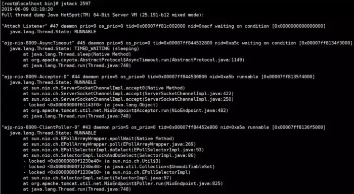 The jstack command prints Java stack traces of Java threads for a specified Java process, core file, or remote debug server.