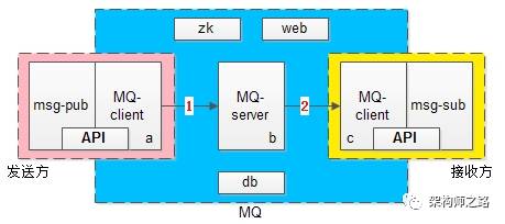 上图是一个MQ的核心架构图,可以分为三大块:(1)发送方 -> 左侧粉色部分;(2)MQ核心集群 -> 中间蓝色部分;(3)接收方 -> 右侧屎黄色部分;