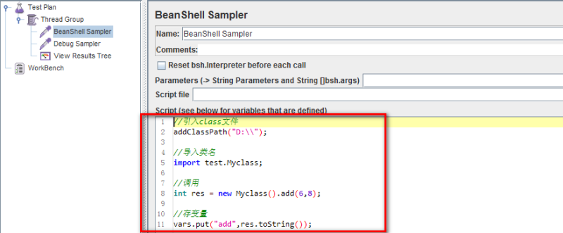 在bean shel中通过source("代码路径")方法引入java,然后调用方法和java一样,new一个class,再调用里面的add 方法。